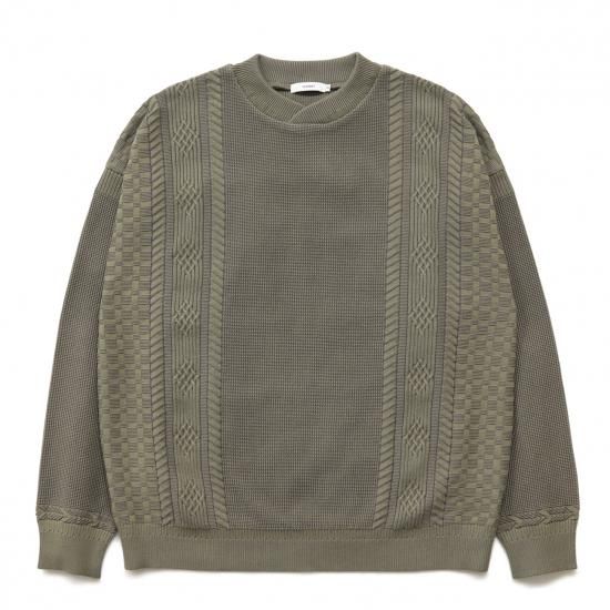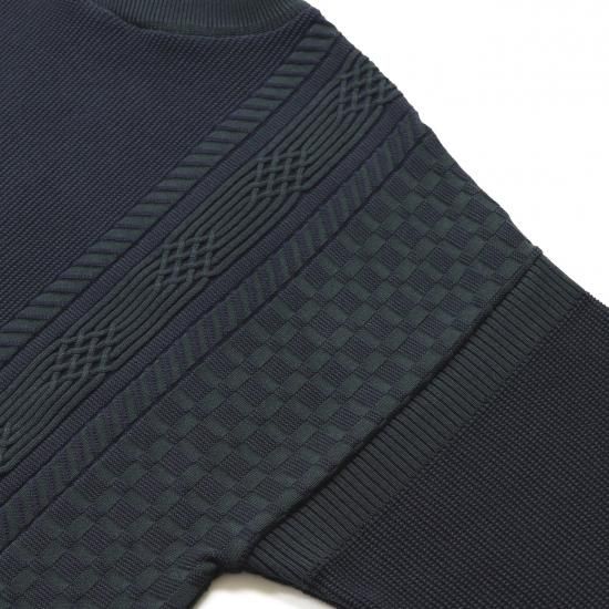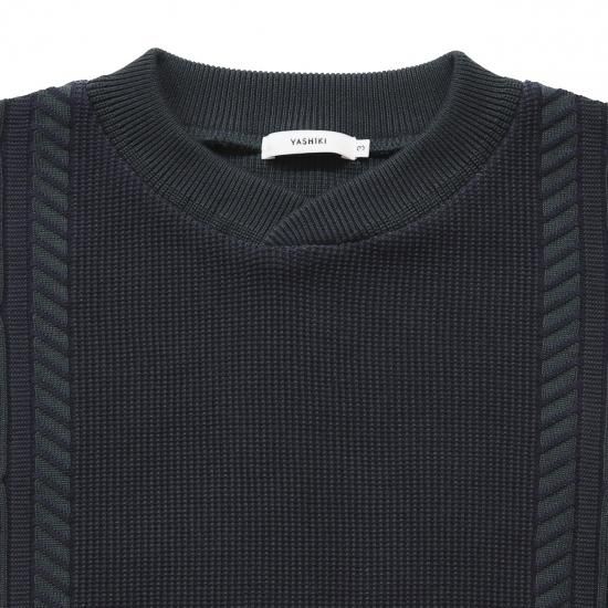 苔生した杉の木の幹を脇の複数の柄で表し、中央と袖の編み地で静けさを表しています。