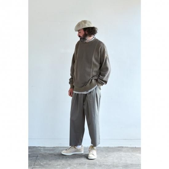 プレーティング編みと言われる表目側と裏目側で異なる糸を編む技法を使用し、表にうっすらと見える裏の糸で奥行きのある表情に仕上げました。