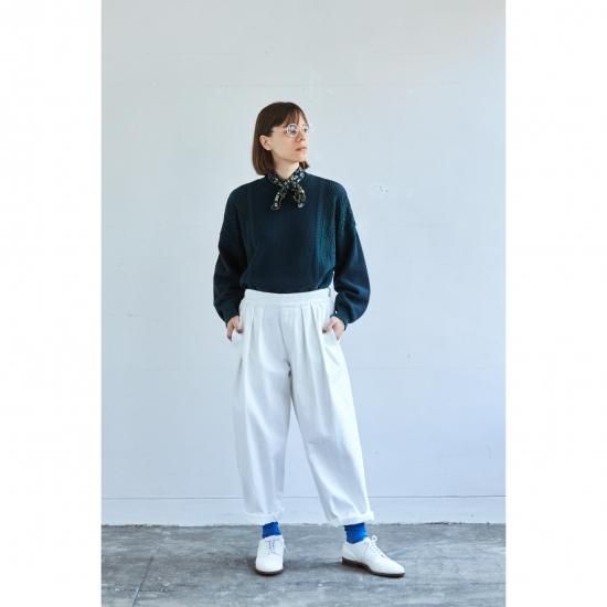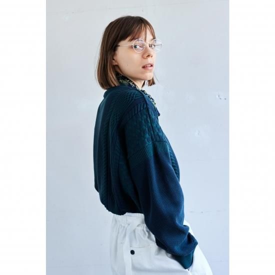 プレーティング編みと言われる表目側と裏目側で異なる糸を編む技法を使用し、表にうっすらと見える裏の糸で奥行きのある表情に仕上げました。