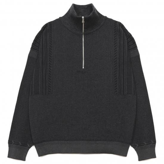 プレーティング編みと言われる表目側と裏目側で異なる糸を編む技法を使用し、表と裏で糸の色を変えて、2色で編むことで奥行きのある表情に仕上げました。