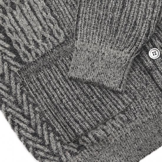 身頃中央と袖の柄で雪に覆われた畝や畦道を表し、身頃横のケーブル柄で轍を表し、身頃脇の柄で雪が積もった木々を表しています。